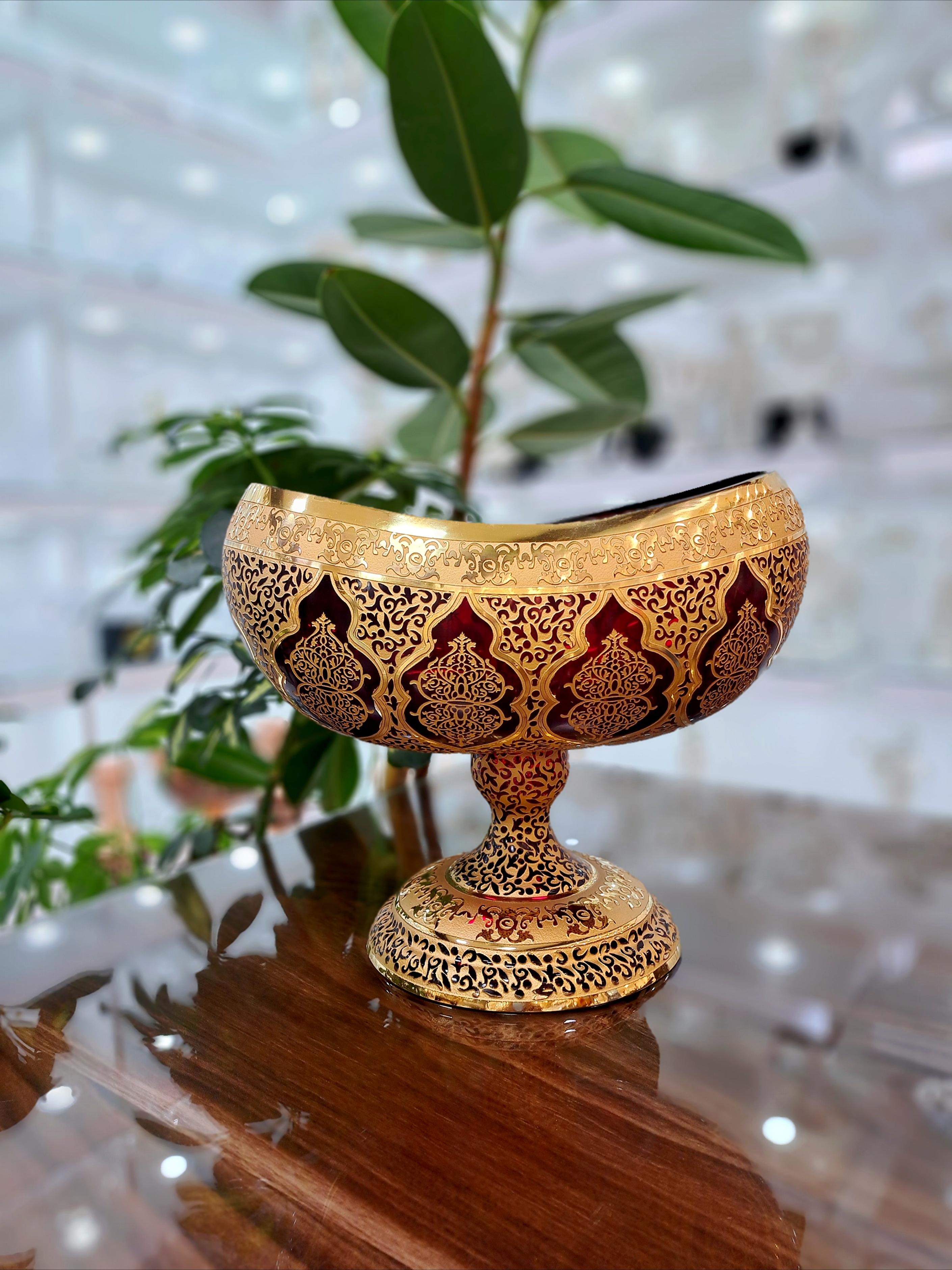ست سه تیکه شمعدان و کشکول کریستال طلاکوب طرح کاستل رنگ قرمز با طلاکاری هلند