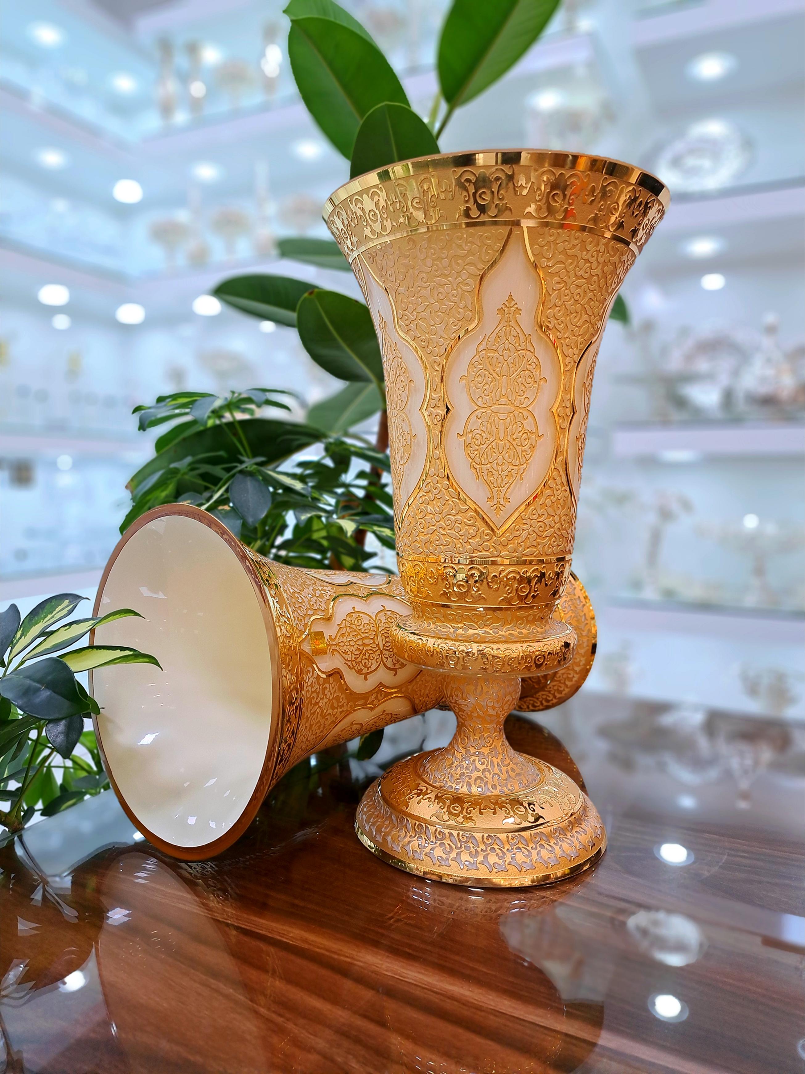 گلدان کریستال طلاکوب کاپی طرح کاستل رنگ کرم با طلاکاری هلند سایز بزرگ مجموعه دوعددی
