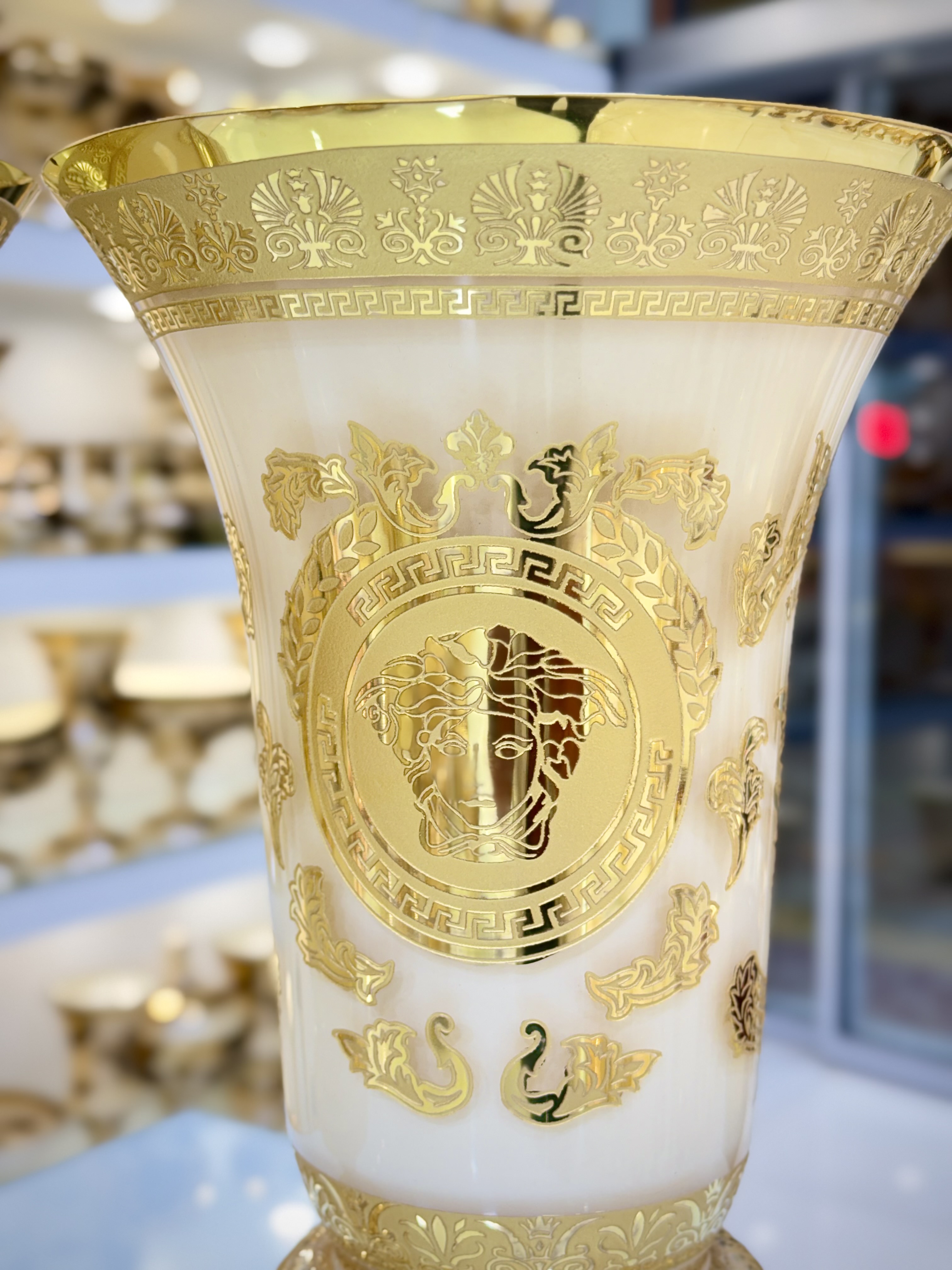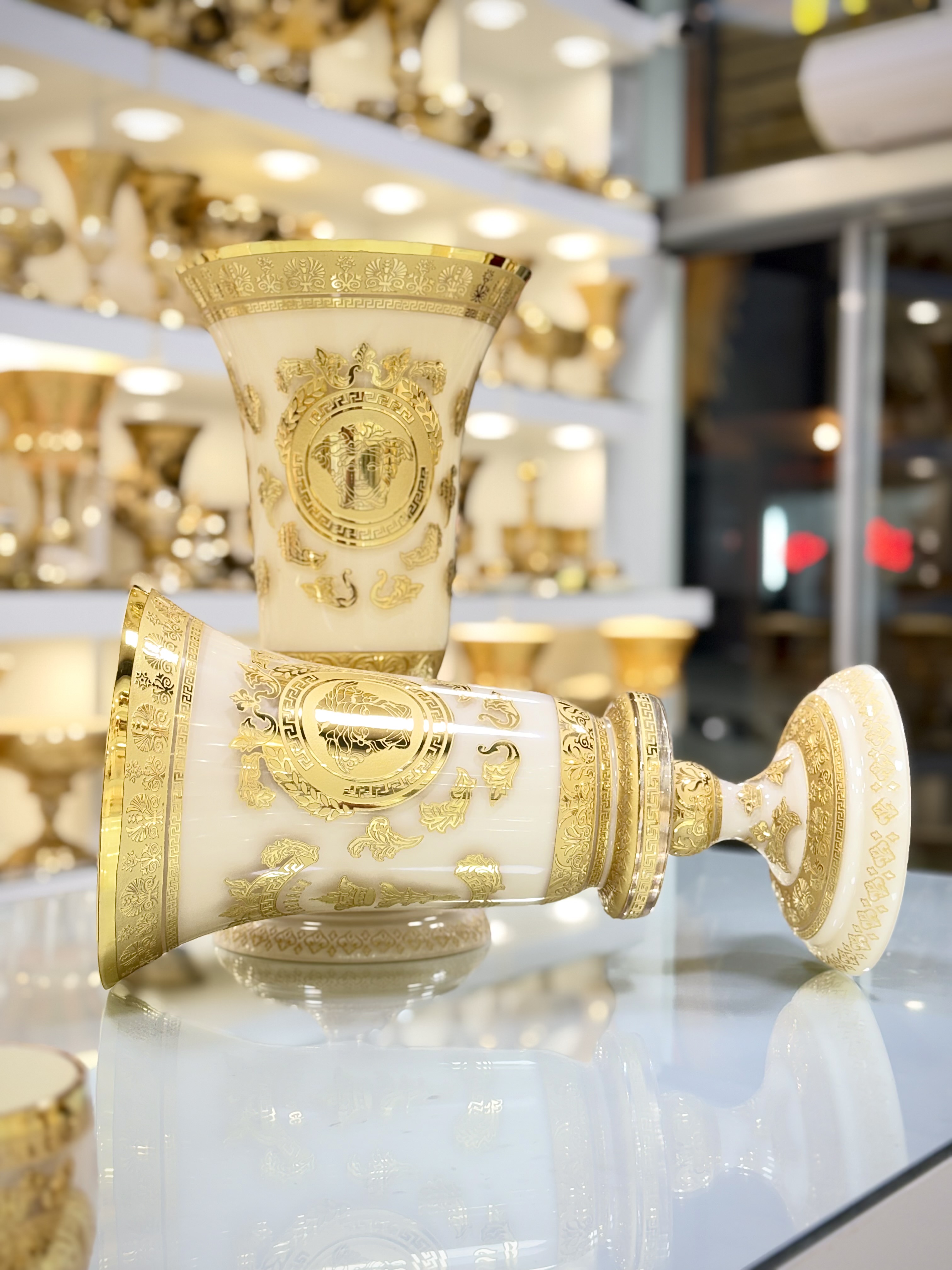 گلدان کریستال طلاکوب طرح ورساچه مدل نیم پایه رنگ کرم با طلاکاری هلند