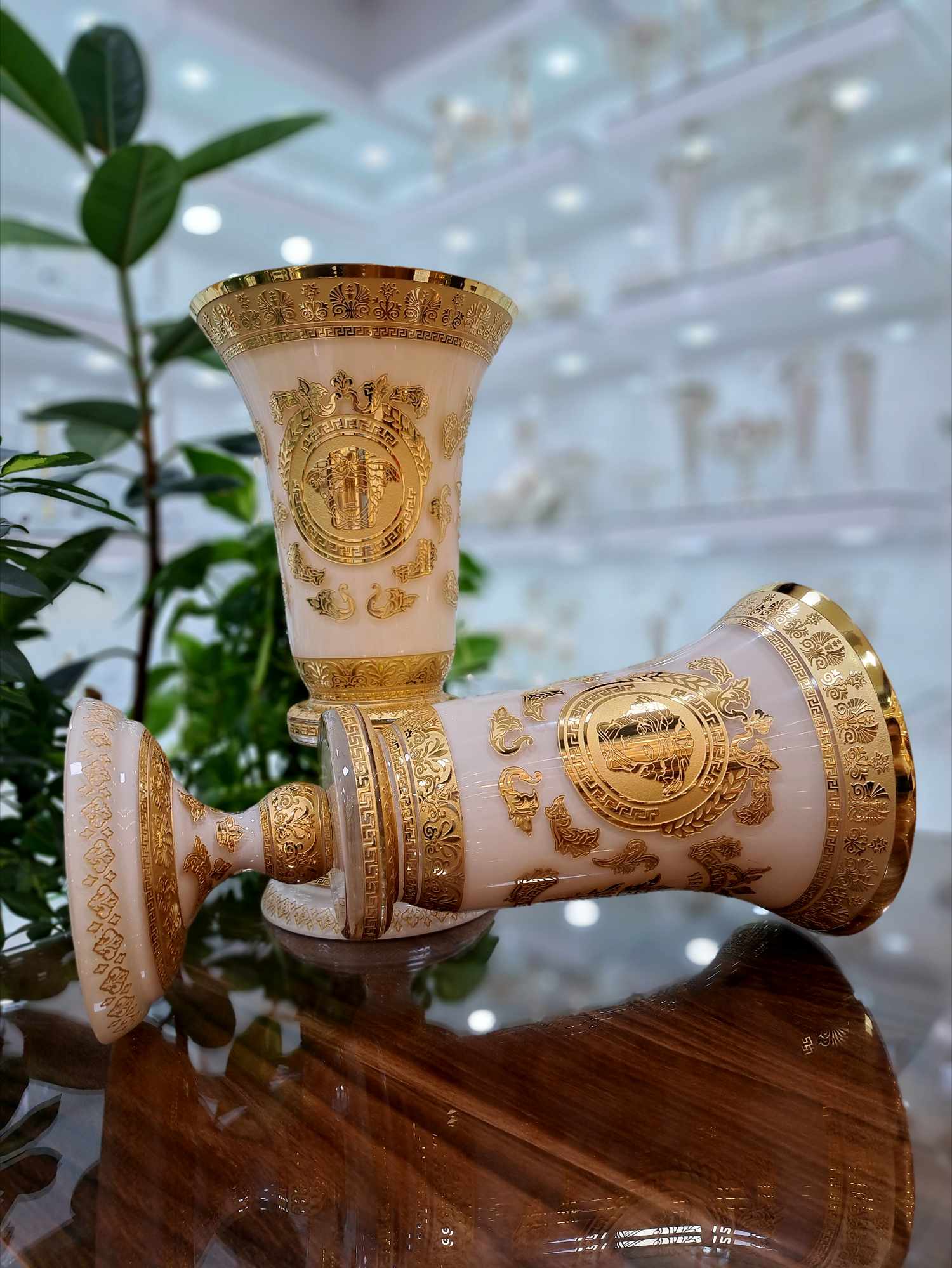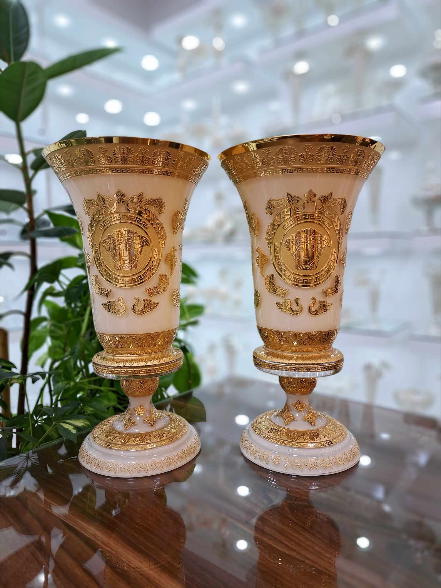 ست سه تیکه گلدان و میوه خوری کریستال طلاکوب طرح ورساچه رنگ کرم از برند پیتر کریستال