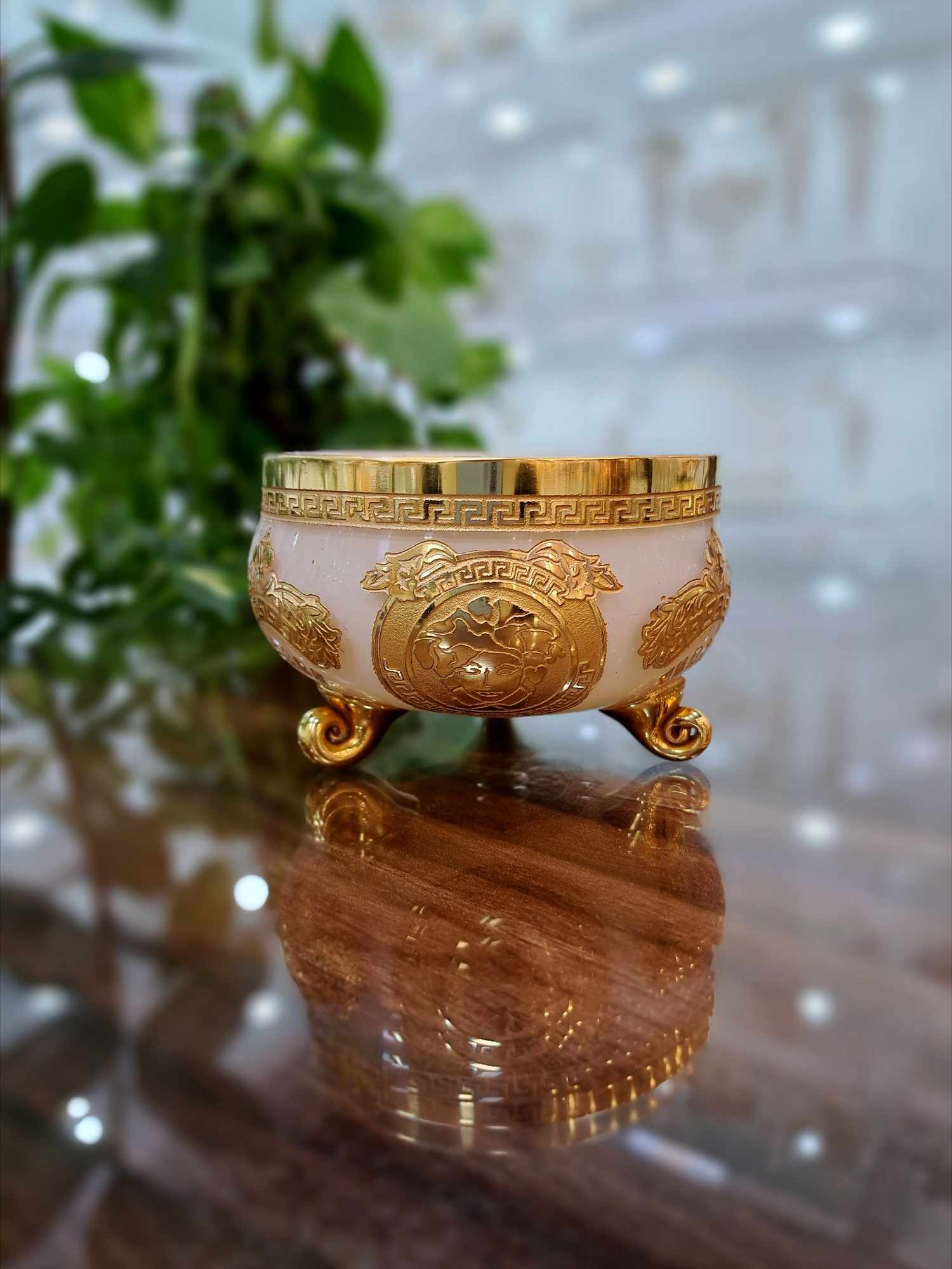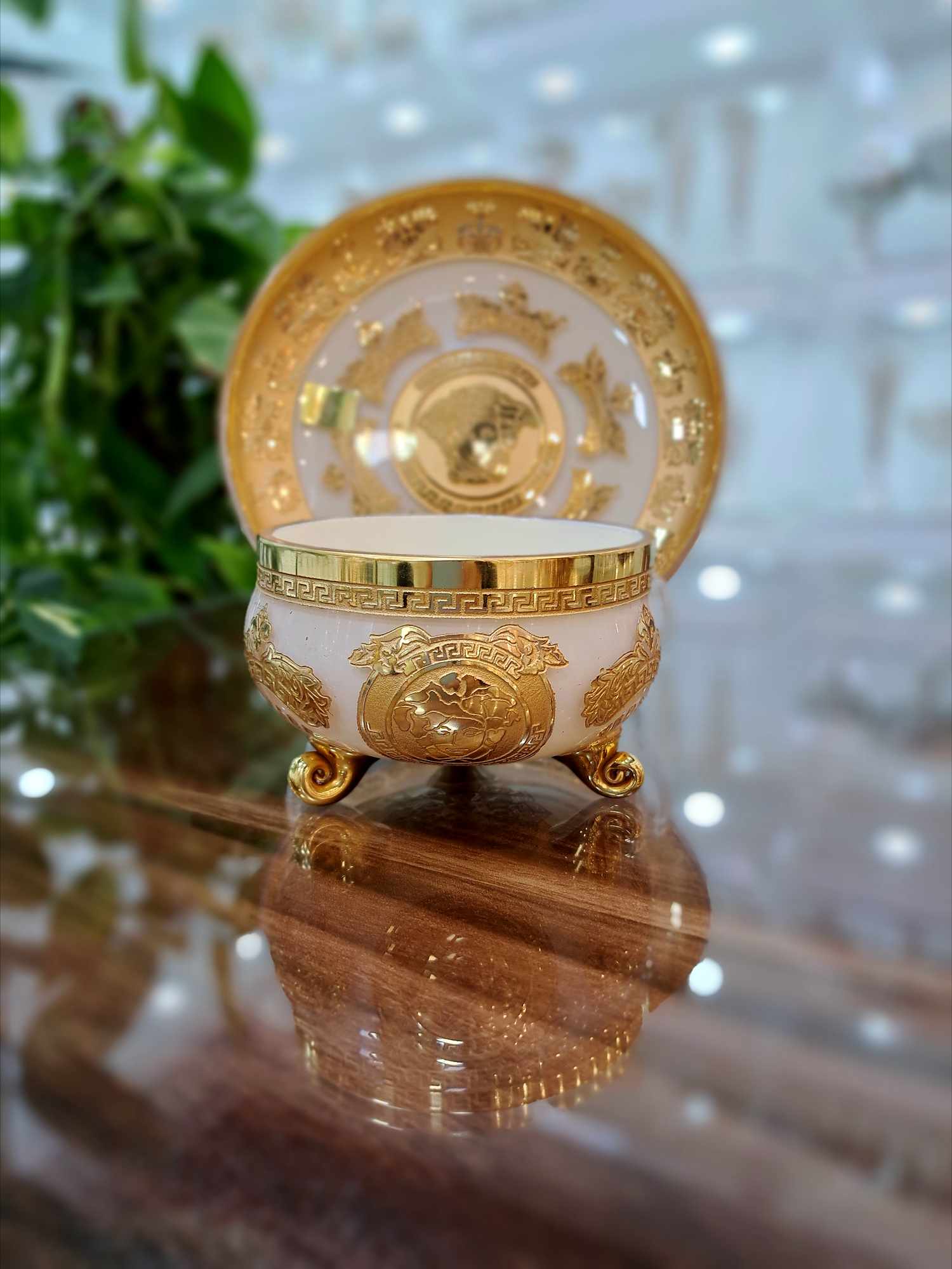 ست پیاله و پیش دستی کریستال طلاکوب دستساز طرح ورساچه رنگ کرم مجموعه 12 پارچه