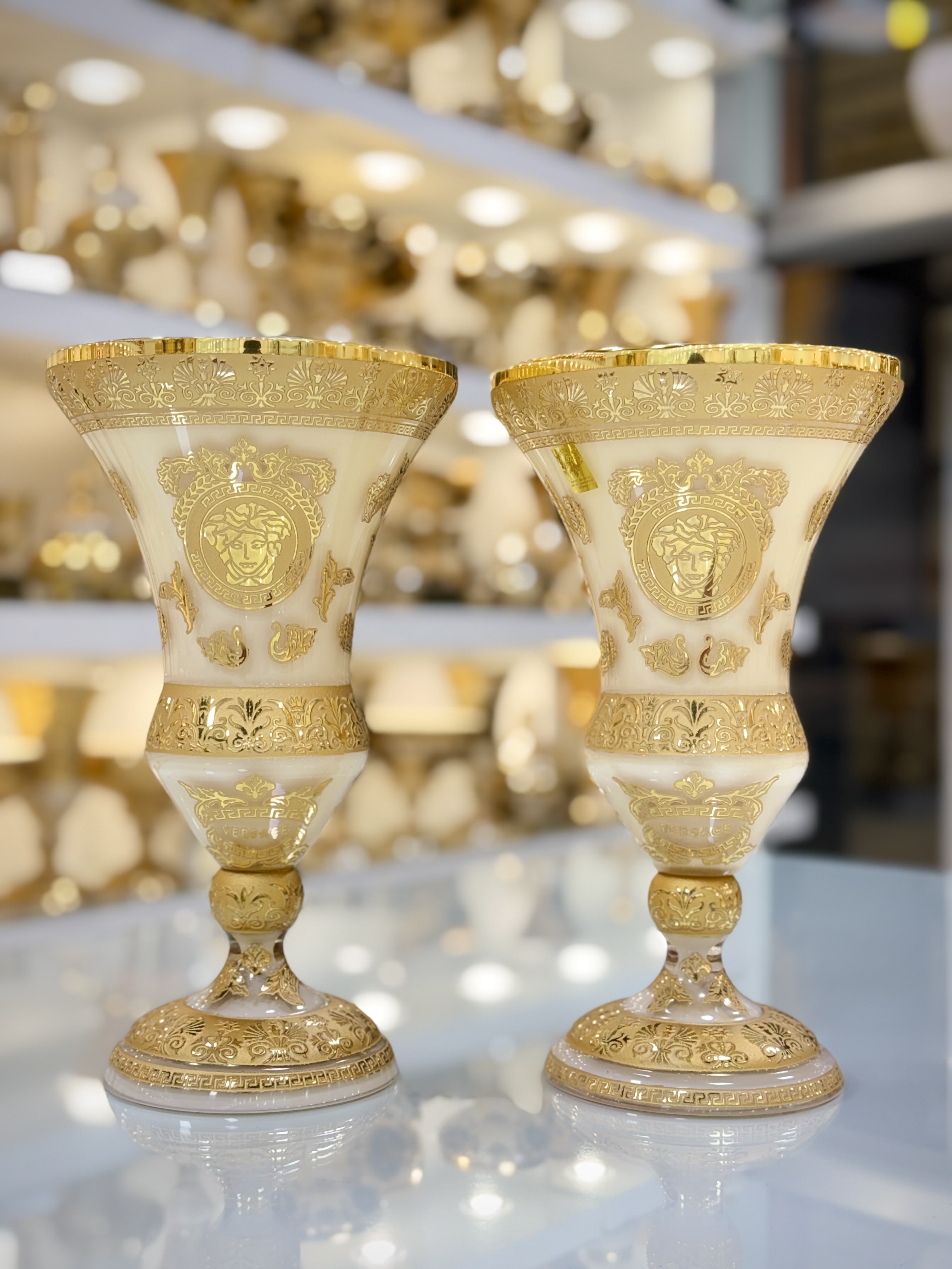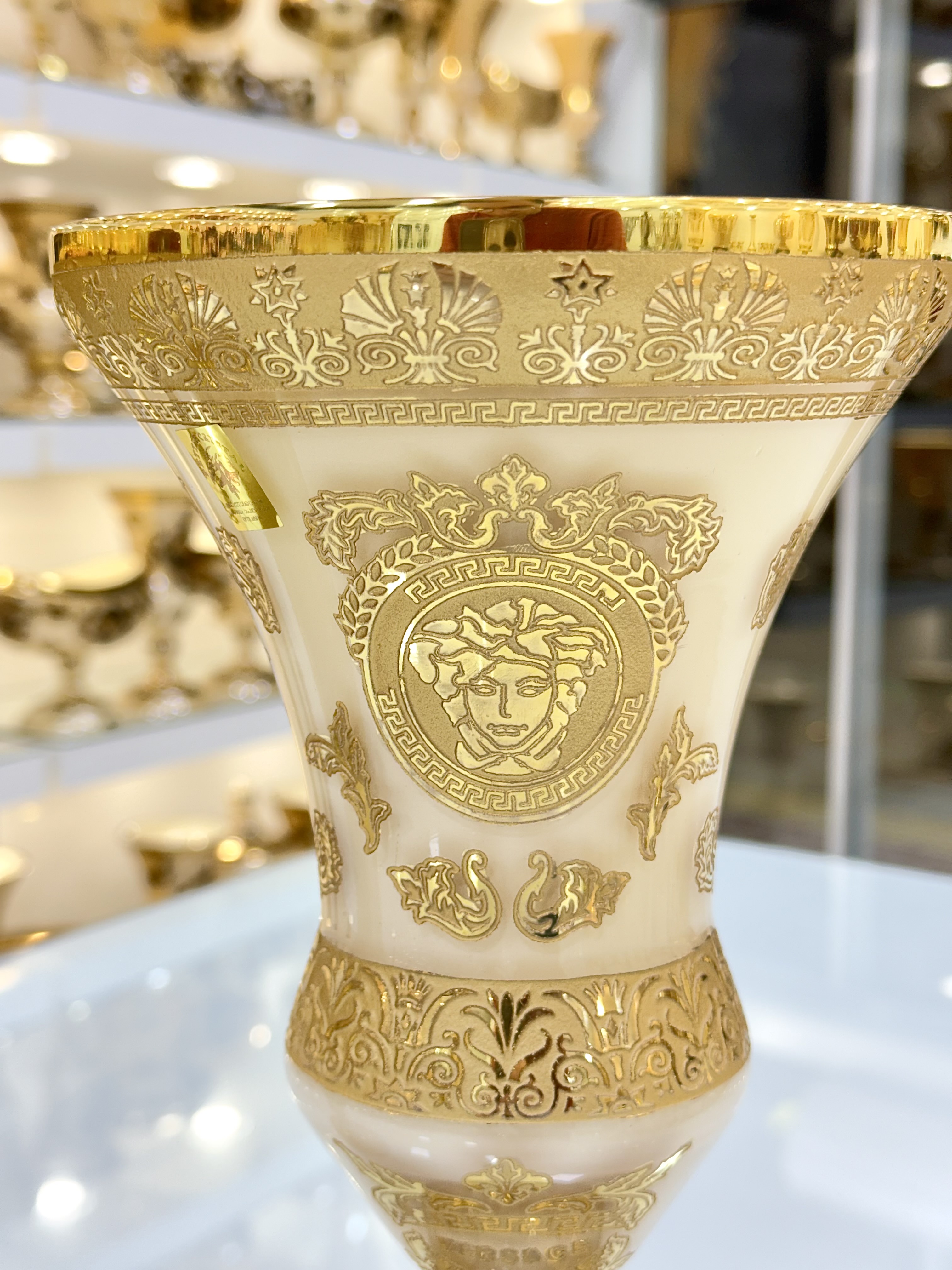 گلدان کریستال طلاکوب پوهار طرح ورساچه رنگ کرم سایز متوسط مجموعه دوعددی