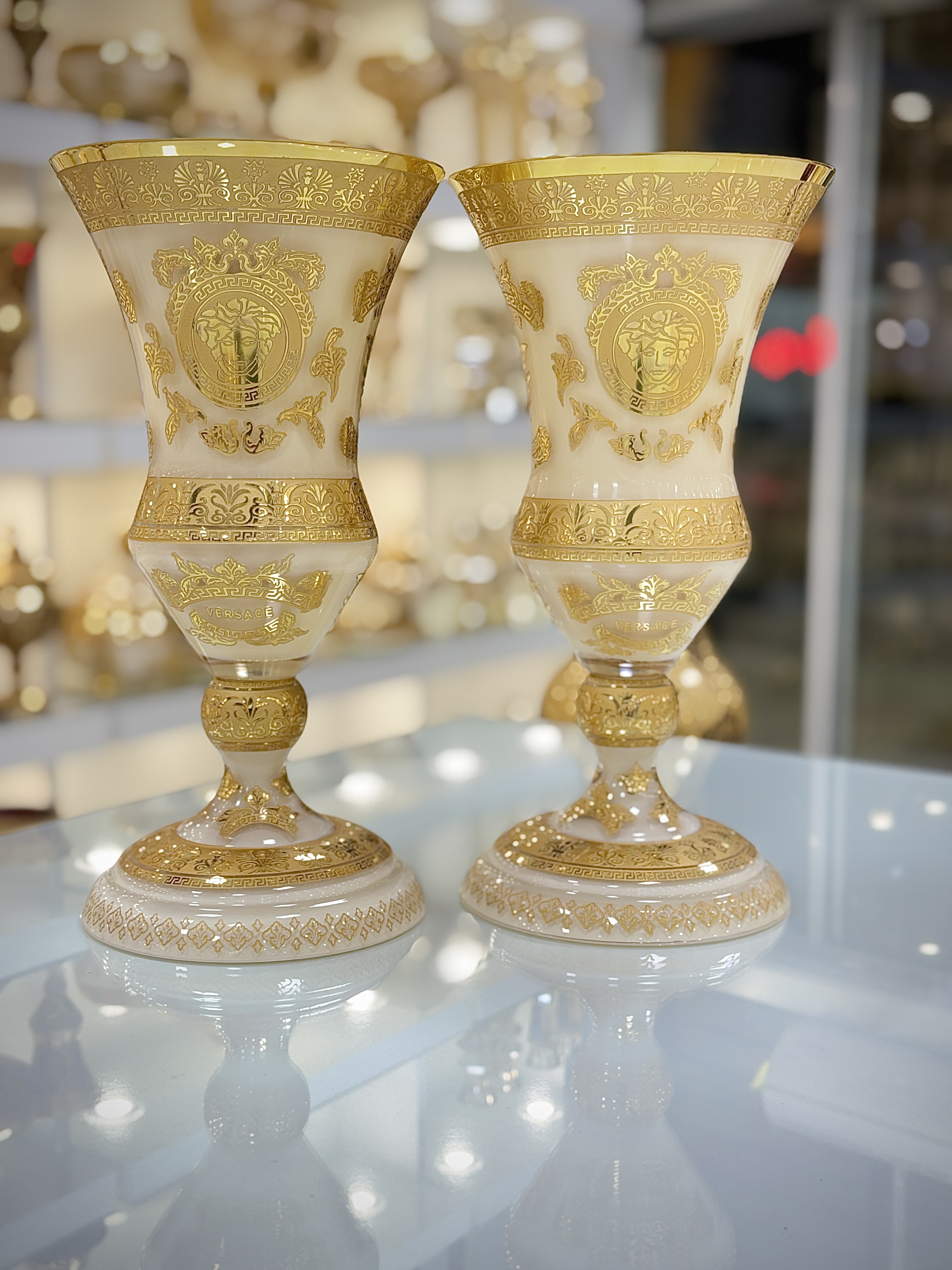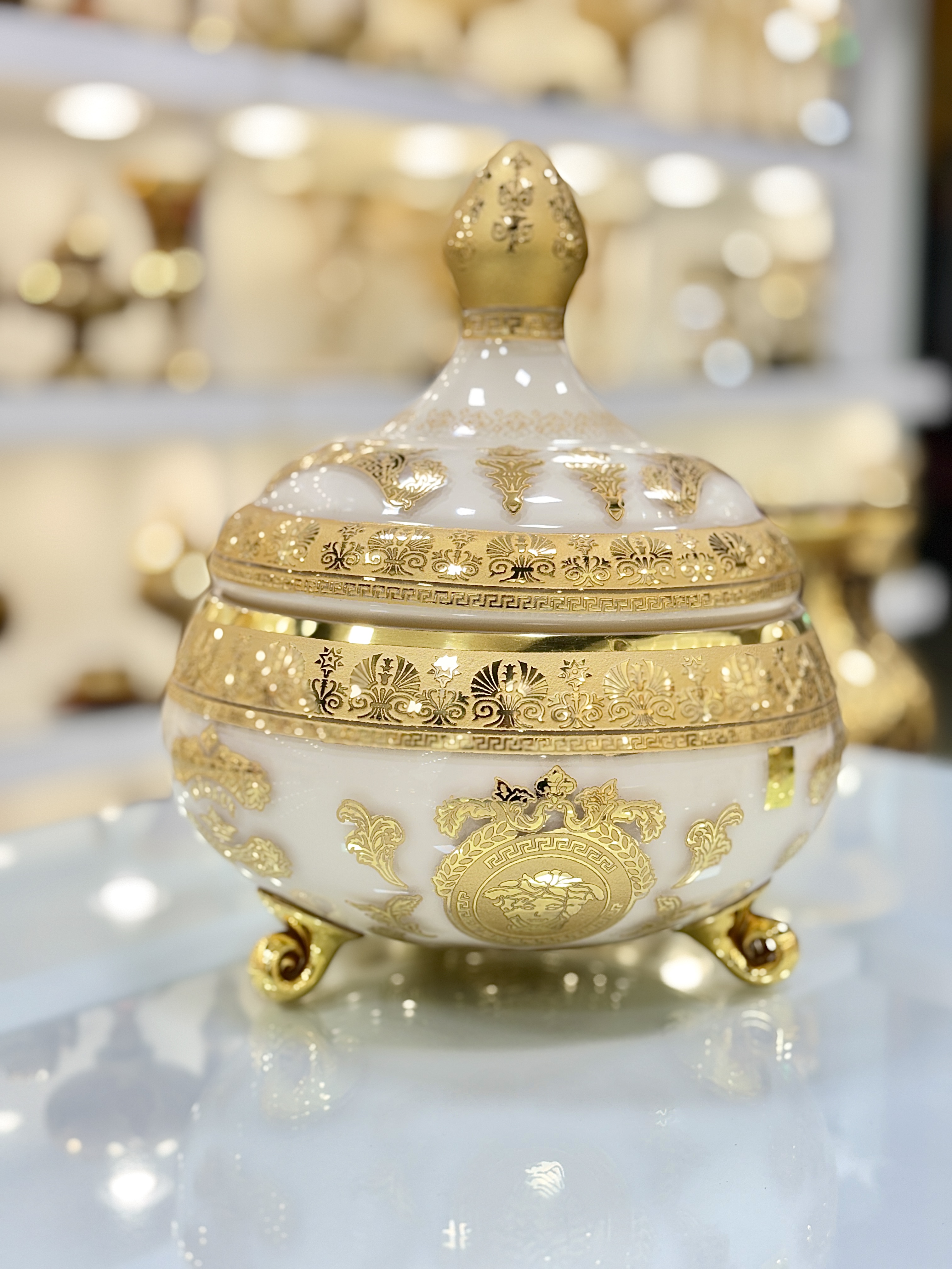 ست سه تیکه گلدان و شکلات خوری سه پایه کریستال طلاکوب طرح ورساچه رنگ کرم با تراش برجسته