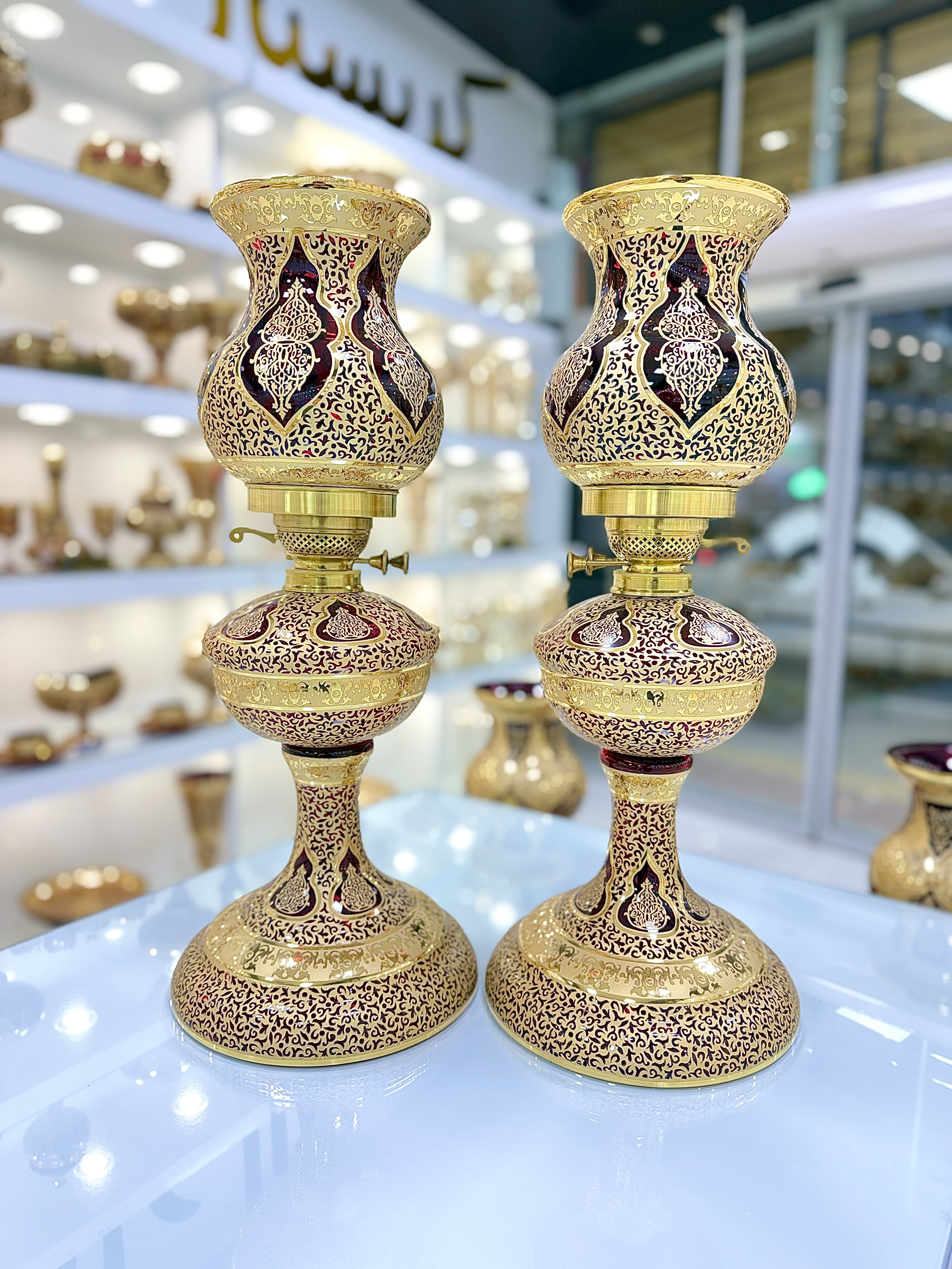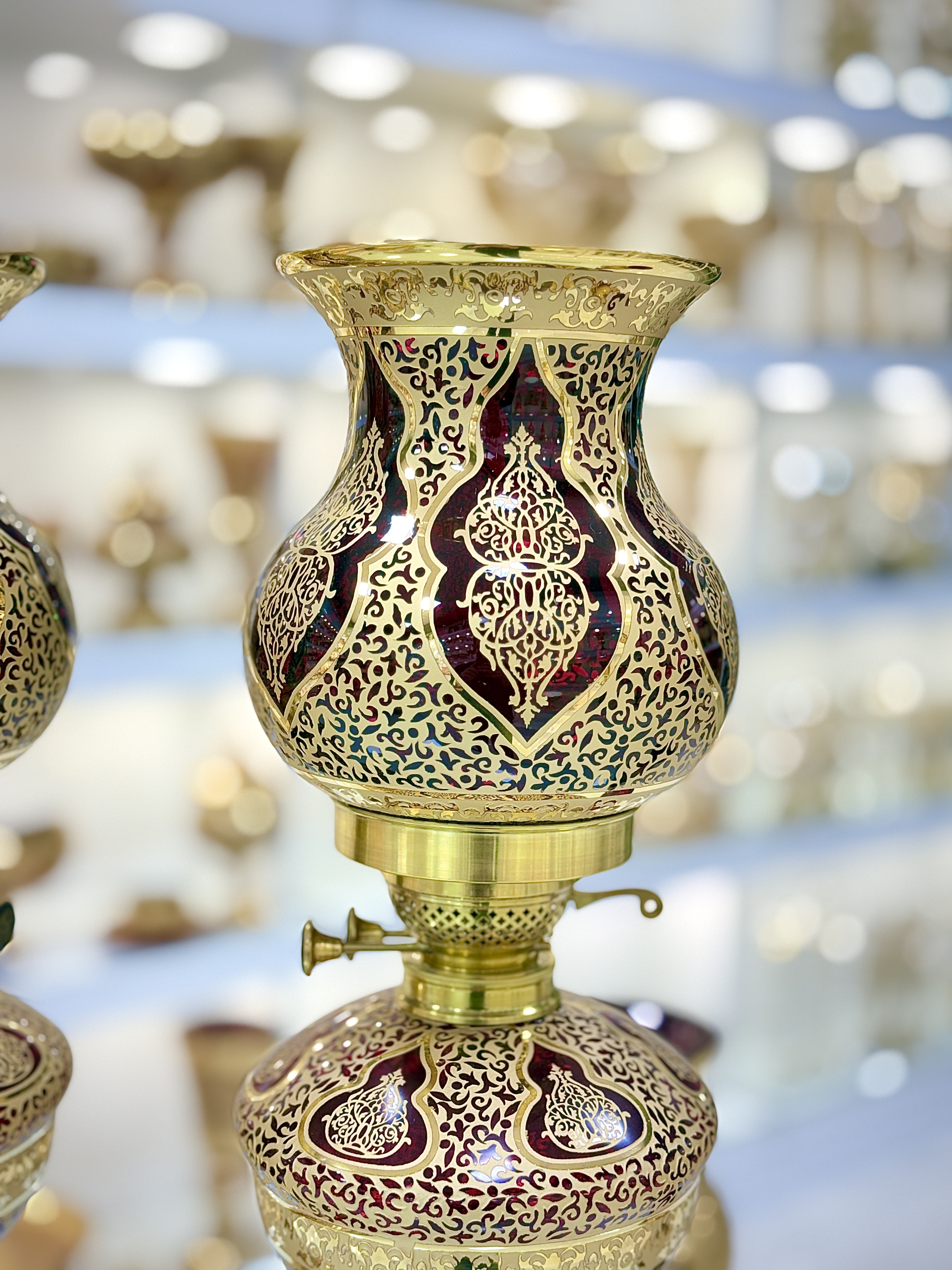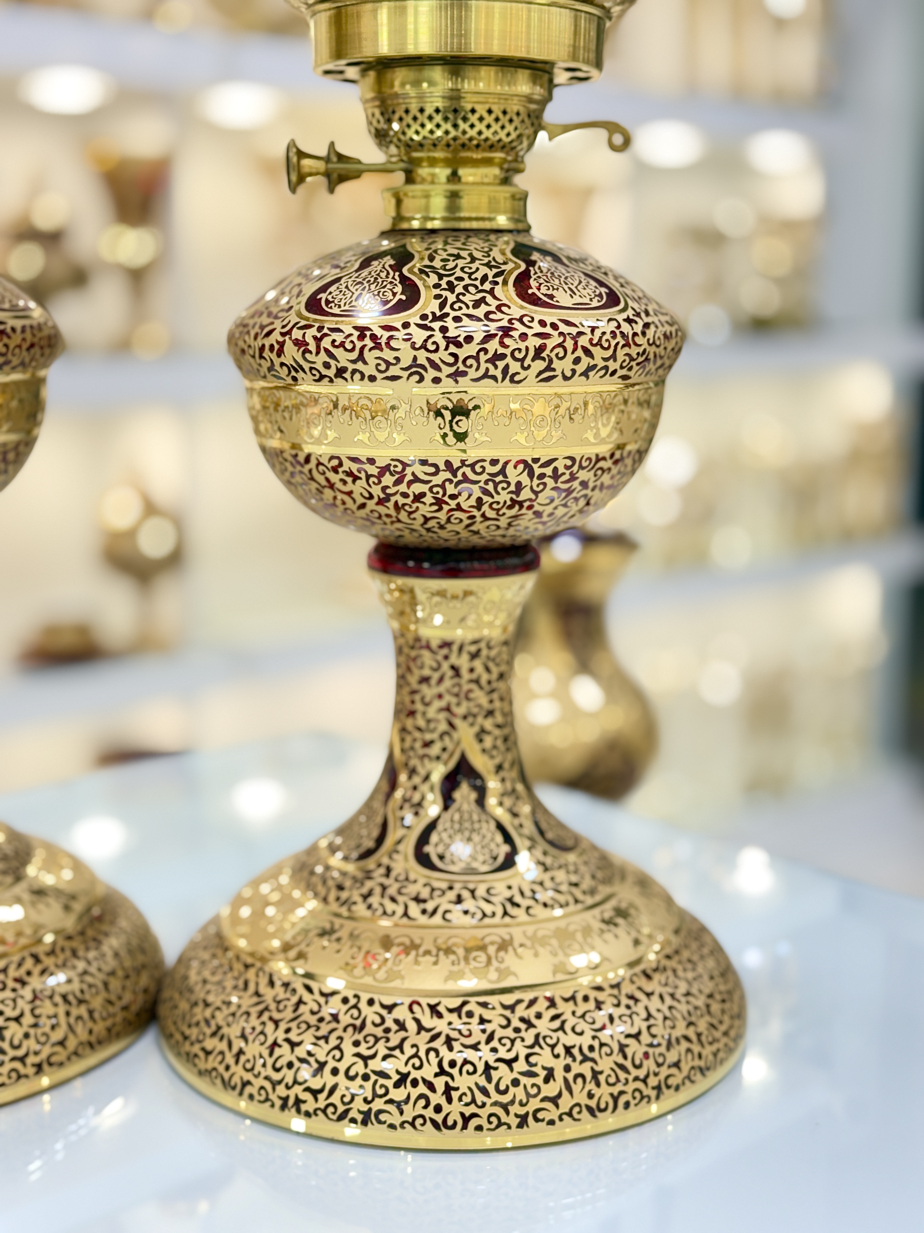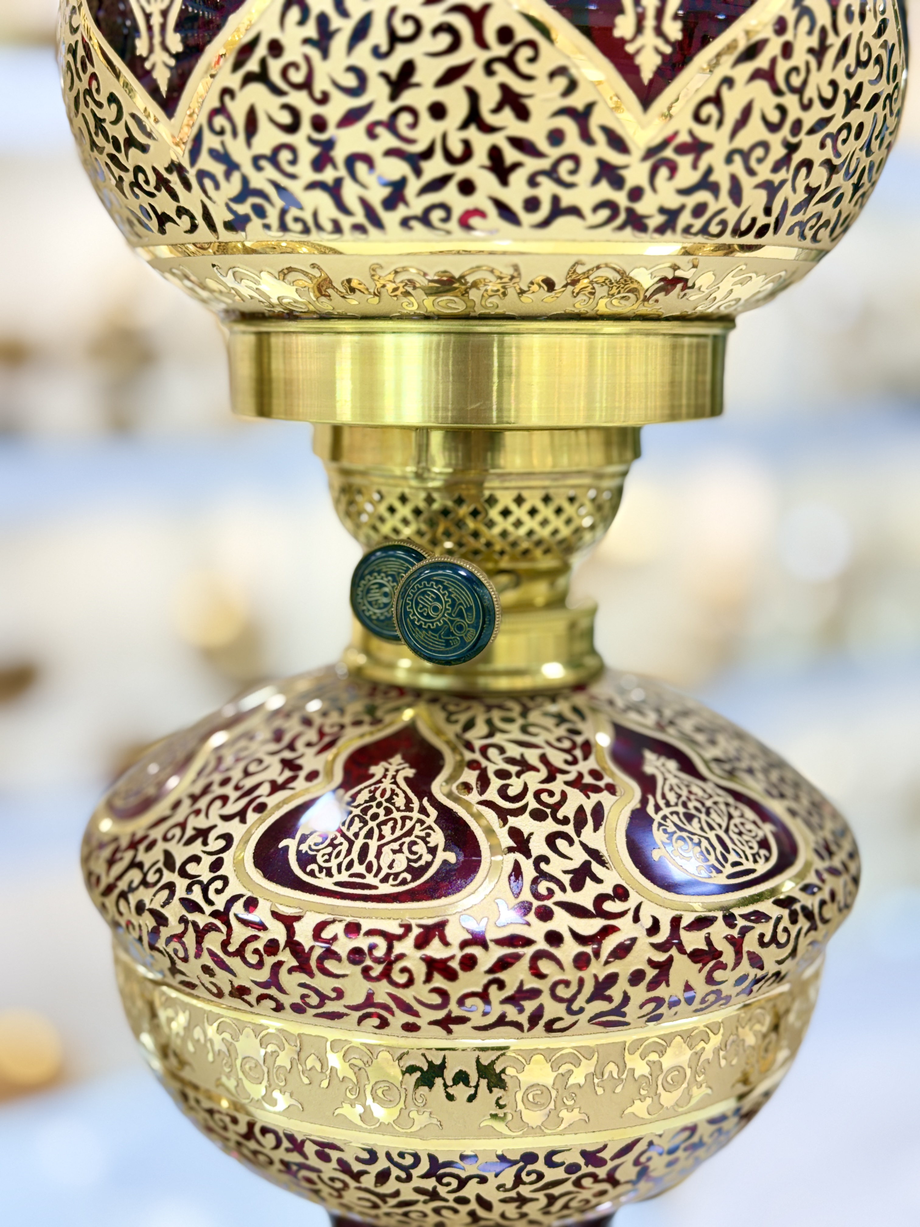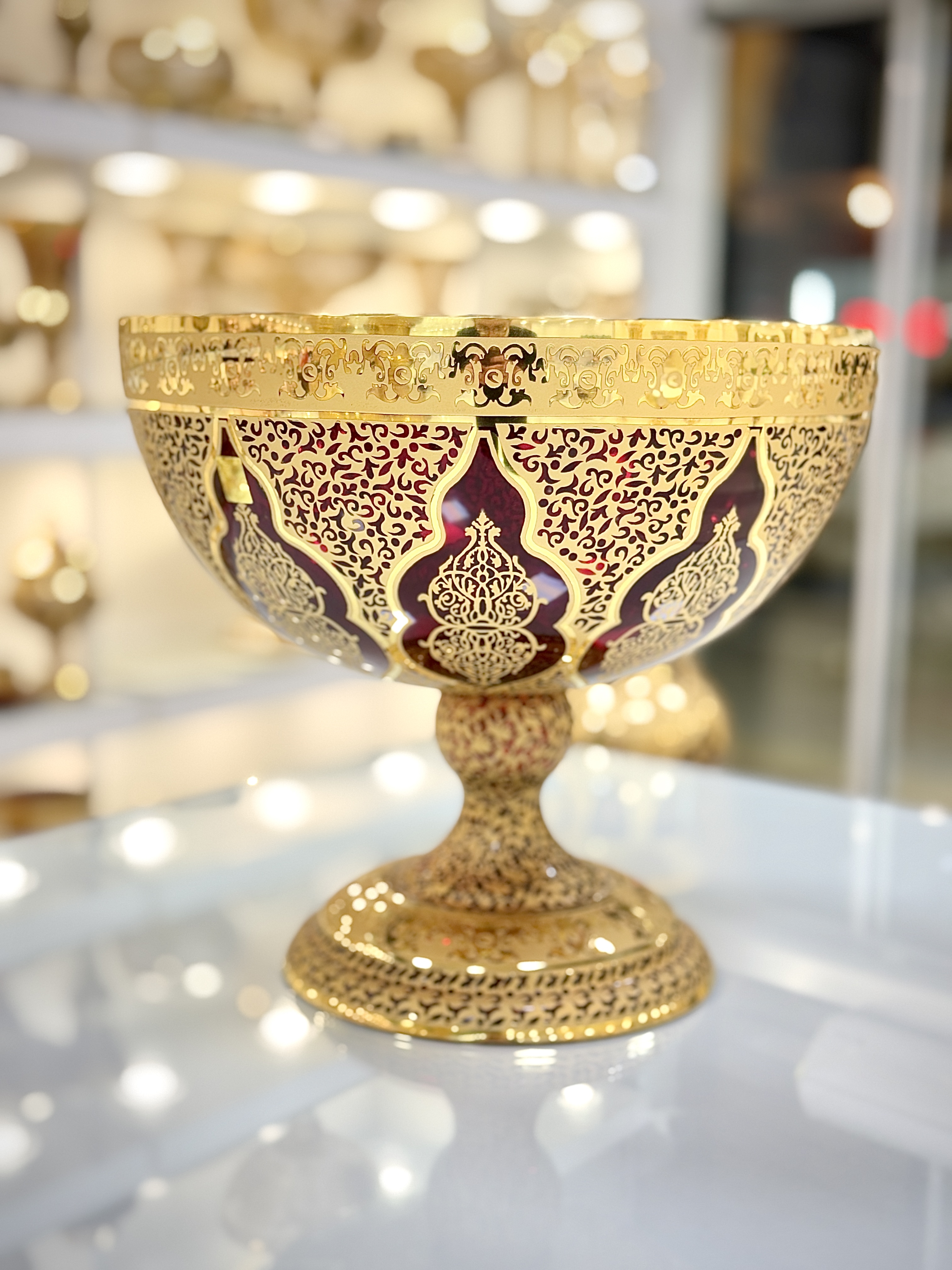 ست سه تیکه چراغ و میوه خوری کریستال طلاکوب طرح کاستل رنگ قرمز سایز بزرگ