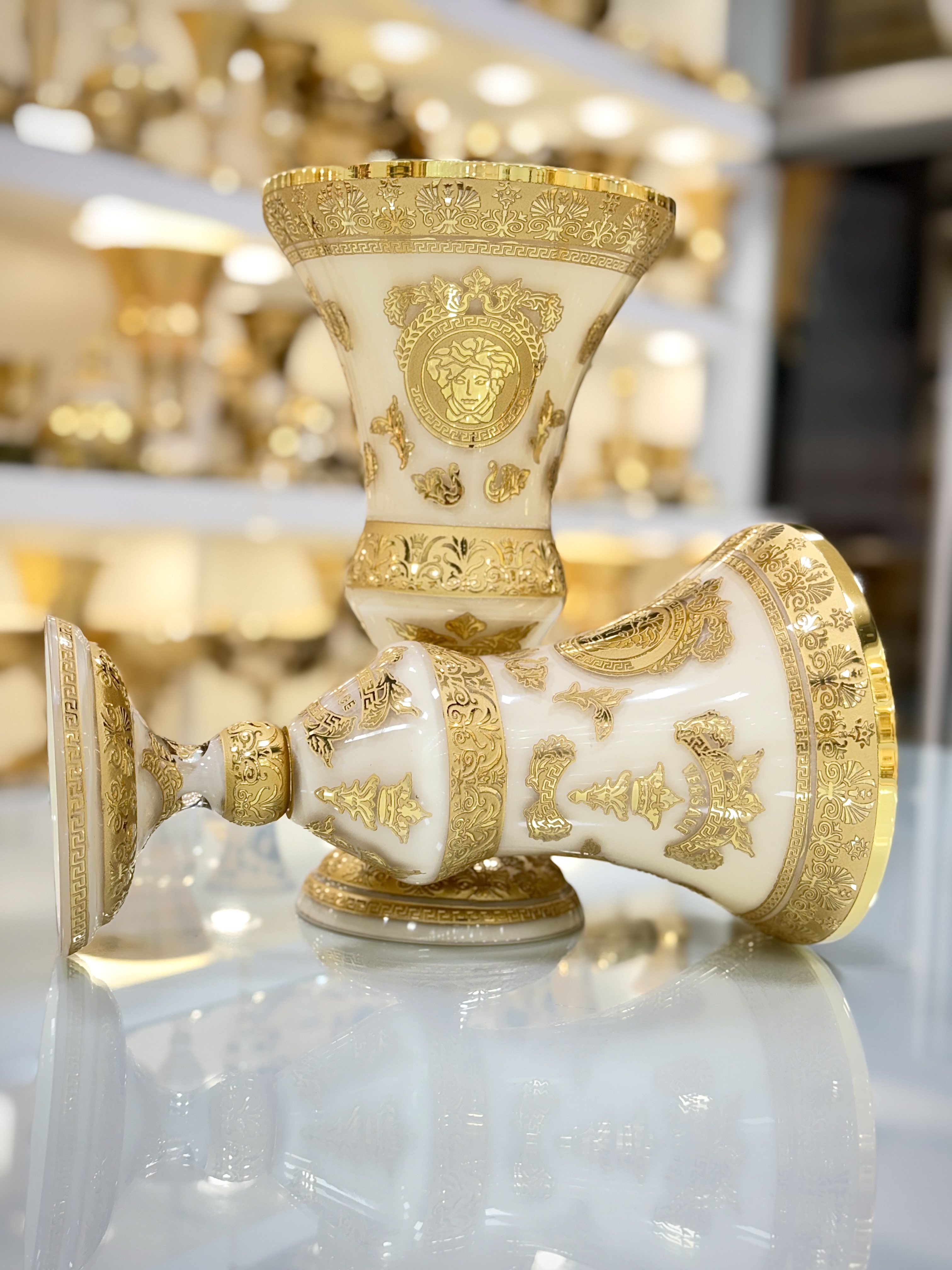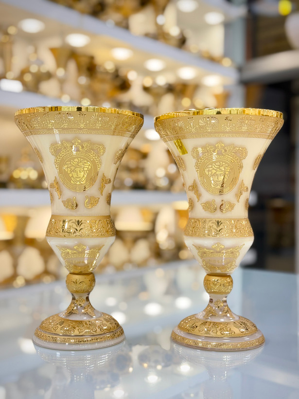 گلدان کریستال طلاکوب دستساز طرح ورساچه رنگ کرم سایز کوچک مجموعه دوعددی