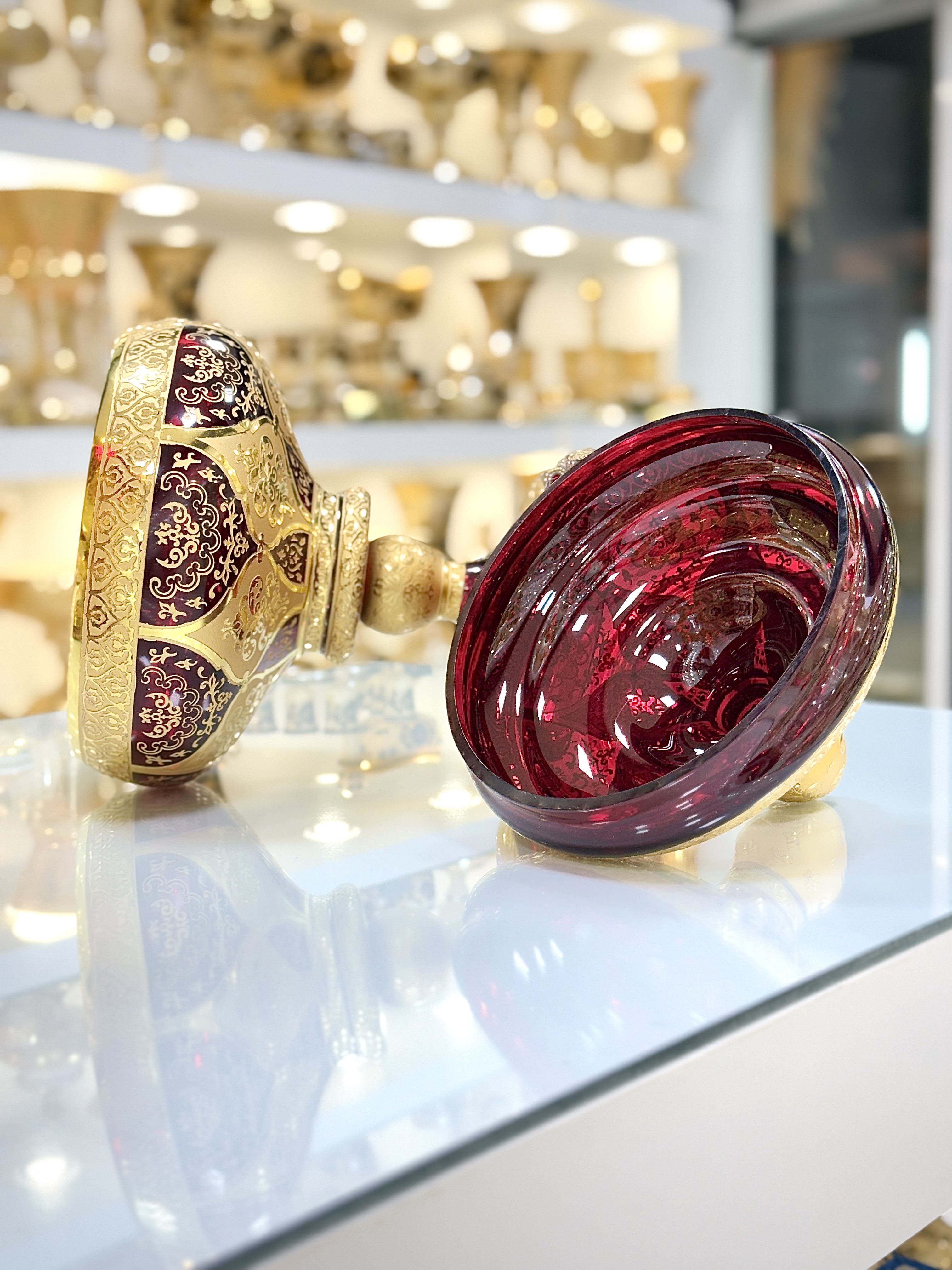 از آنجایی که خلق این آثار هنری از صفر تا صد : از تولید ظرف و طلاکاری گرفته تا تراش های بینظیر و شاهکار روی محصول و... هنر دست اساتید متبحر و مجرب میباشد هرقطعه از این کریستال فضای شما را به یک فضای لوکس و هنری تبدیل میکند.