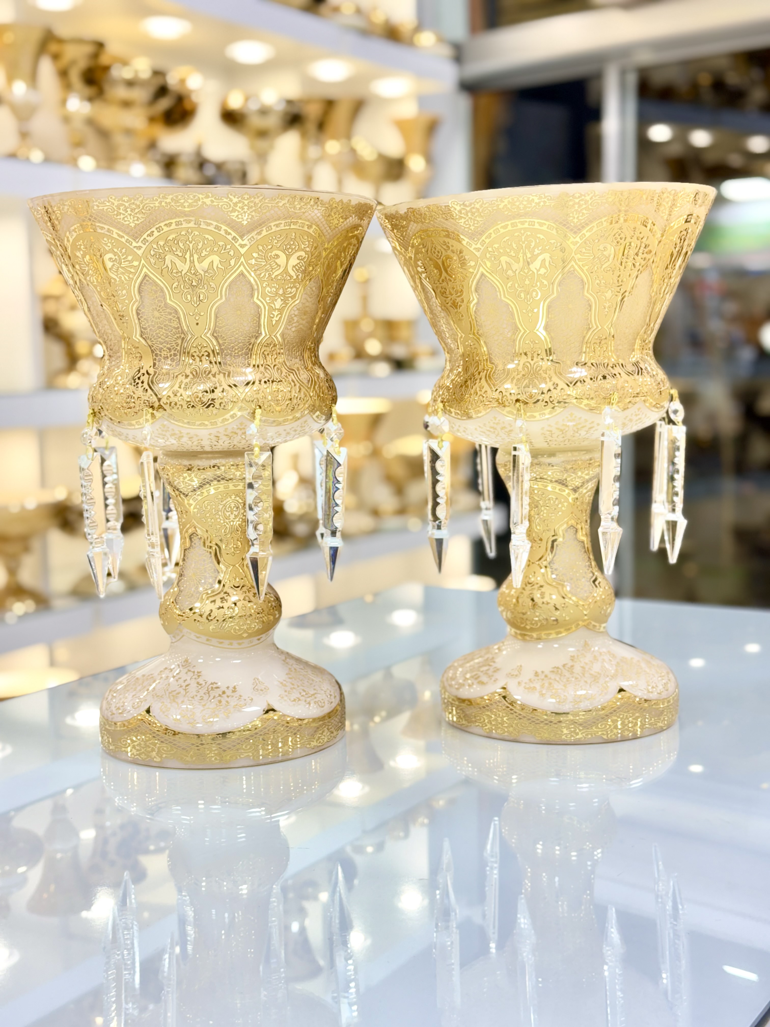 ست سه تیکه لاله آویز و میوه خوری کریستال طلاکوب طرح ژاکلین رنگ کرم سایز بزرگ با تراش برجسته