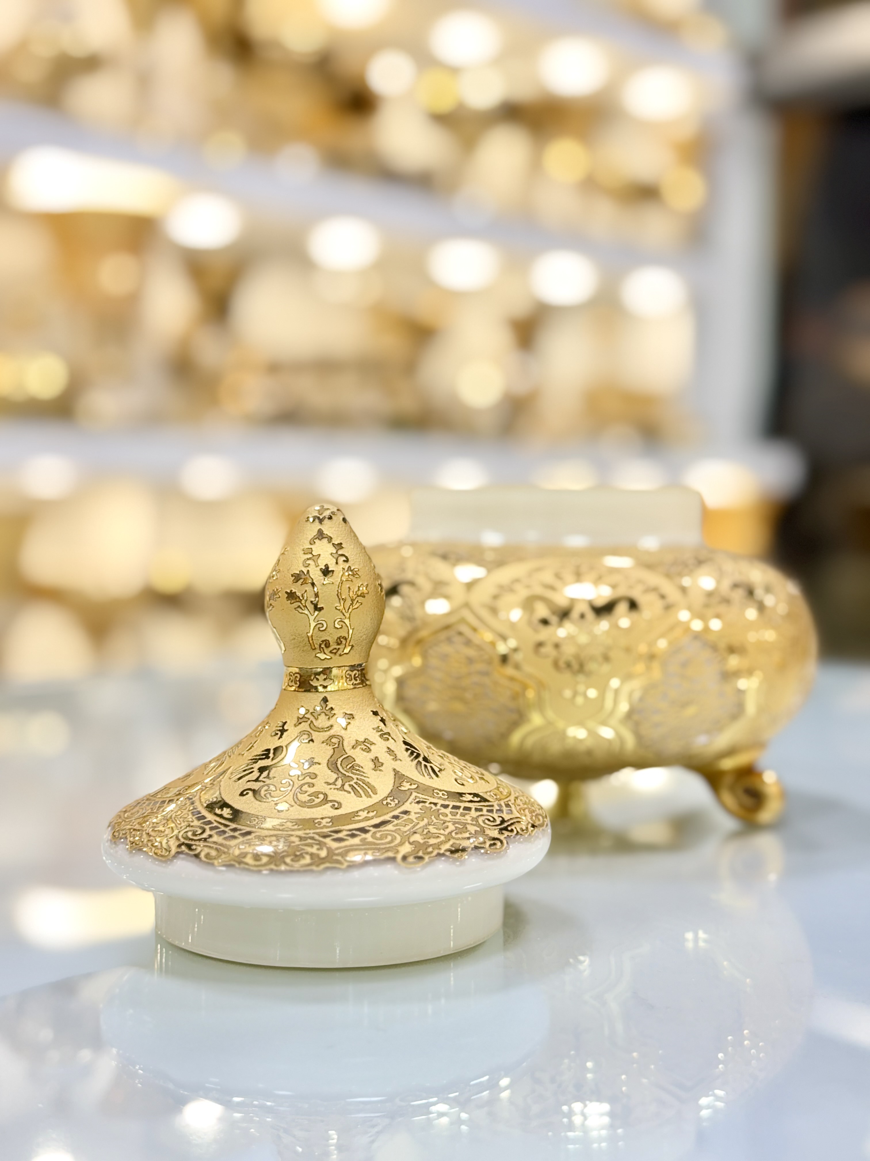 شکلات خوری سه پایه کریستال طلاکوب طرح ژاکلین رنک کرم سایز متوسط