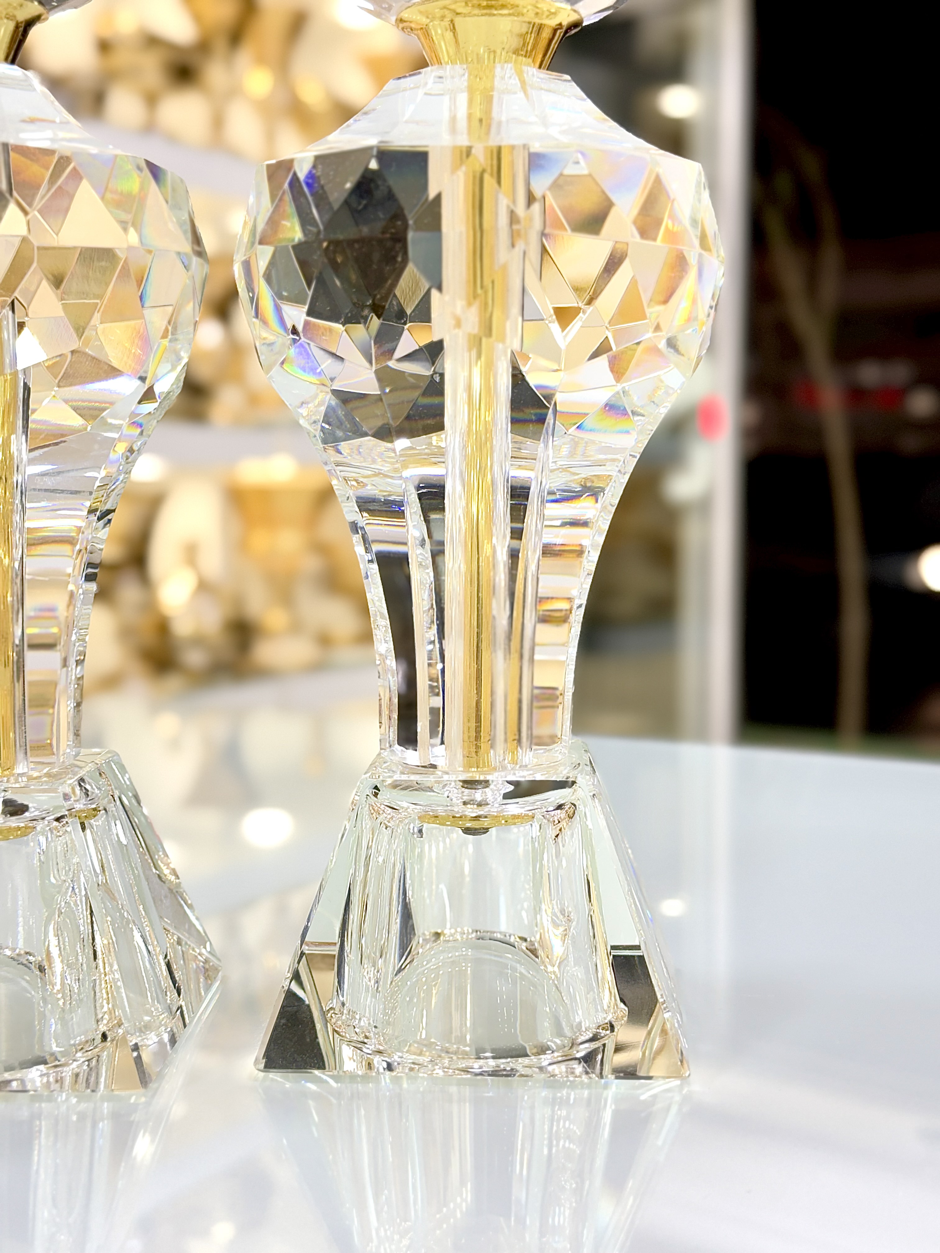 طراحی این شمعدان با ارتفاع ۲۷ سانتیمتر، آن را برای قرارگیری روی میزهای پذیرایی، کنسولها، یا قفسههای دکوری ایدهآل ساخته است. سر تراشدار این اثر هنری، با دقت و ظرافت بینظیری طراحی شده که نور را به شکلی جادویی شکسته و بازتاب میدهد؛ این ویژگی، فضایی گرم، دلنشین و سرشار از درخشندگی ایجاد میکند و جلوهای لوکس و چشمنواز به دکوراسیون شما میبخشد.