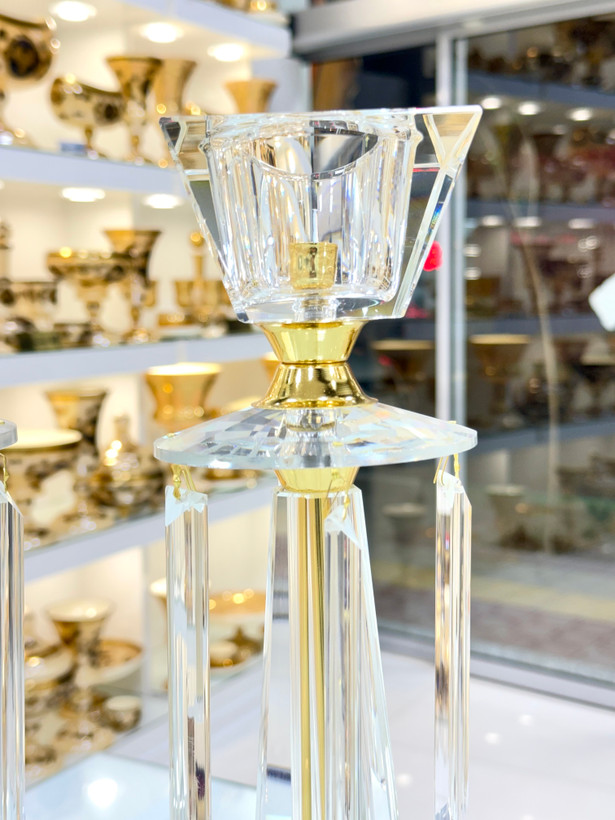 عنصر متمایز این شمعدان، ستون منشوری کریستال است؛ ساختاری ظریف و کشیده که نور شمع را در زوایای مختلف شکسته و انعکاسی چشمنواز و براق ایجاد میکند. ارتفاع ۴۰ سانتیمتر، آن را به یک نقطه کانونی قدرتمند در دکور تبدیل میکند—چه روی میز کنسول، چه در چیدمانهای جفتی، چه کنار آینه و شلفهای لوکس.