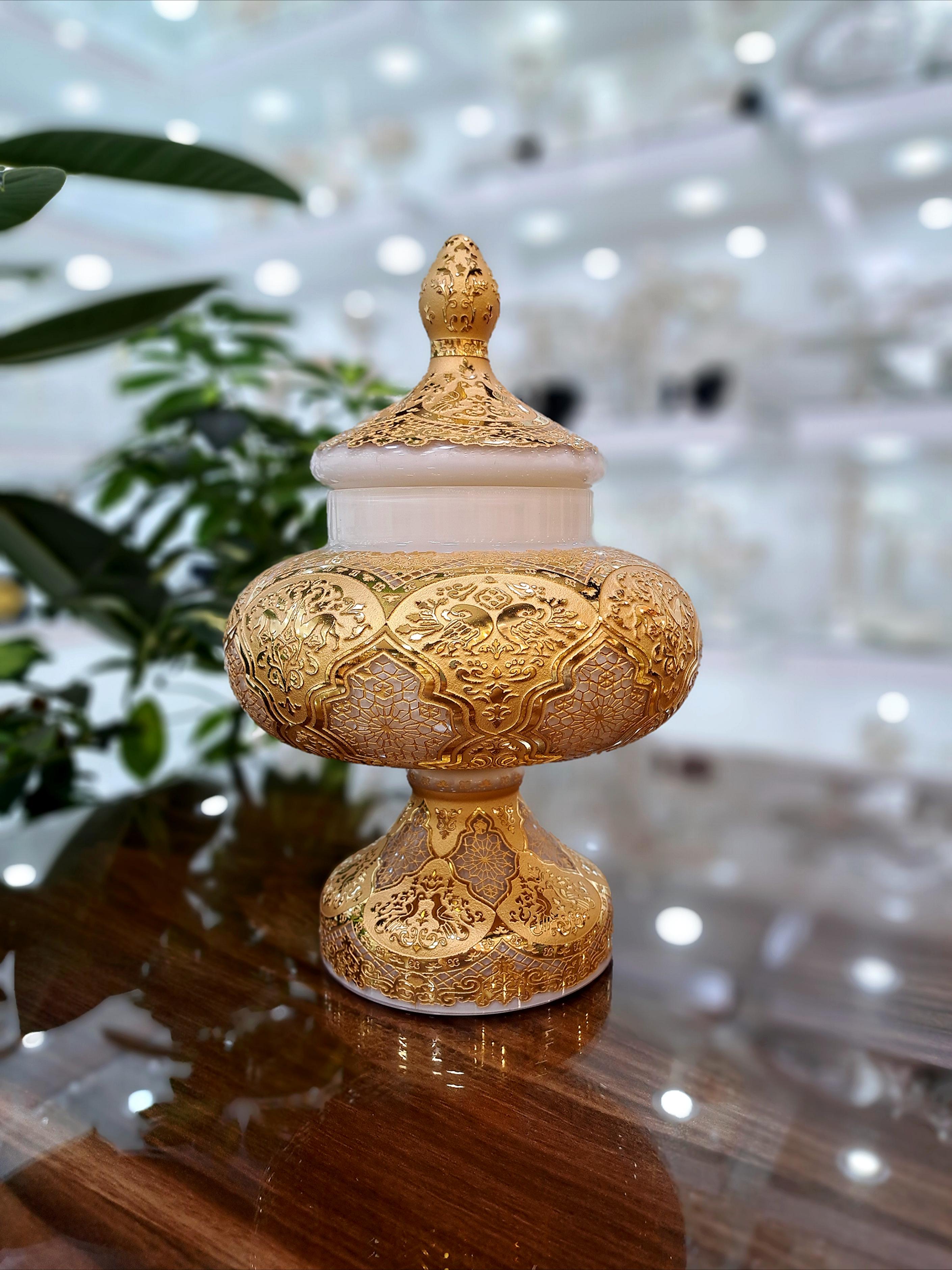 روی محصول از آب طلای 12 عیار اصل هلند استفاده شده است که طلاکاری زیبای روی محصول هنر دست میباشد.
