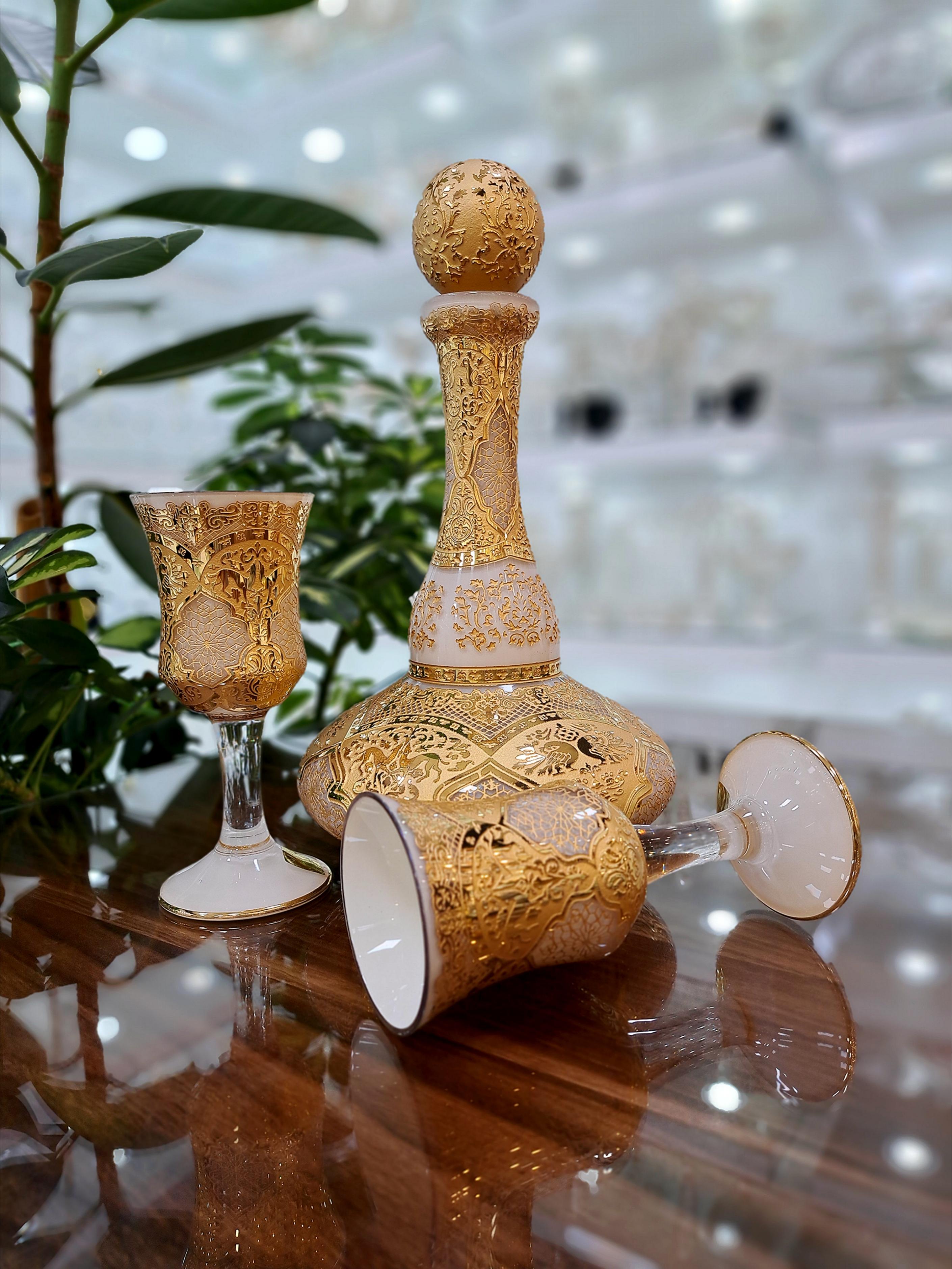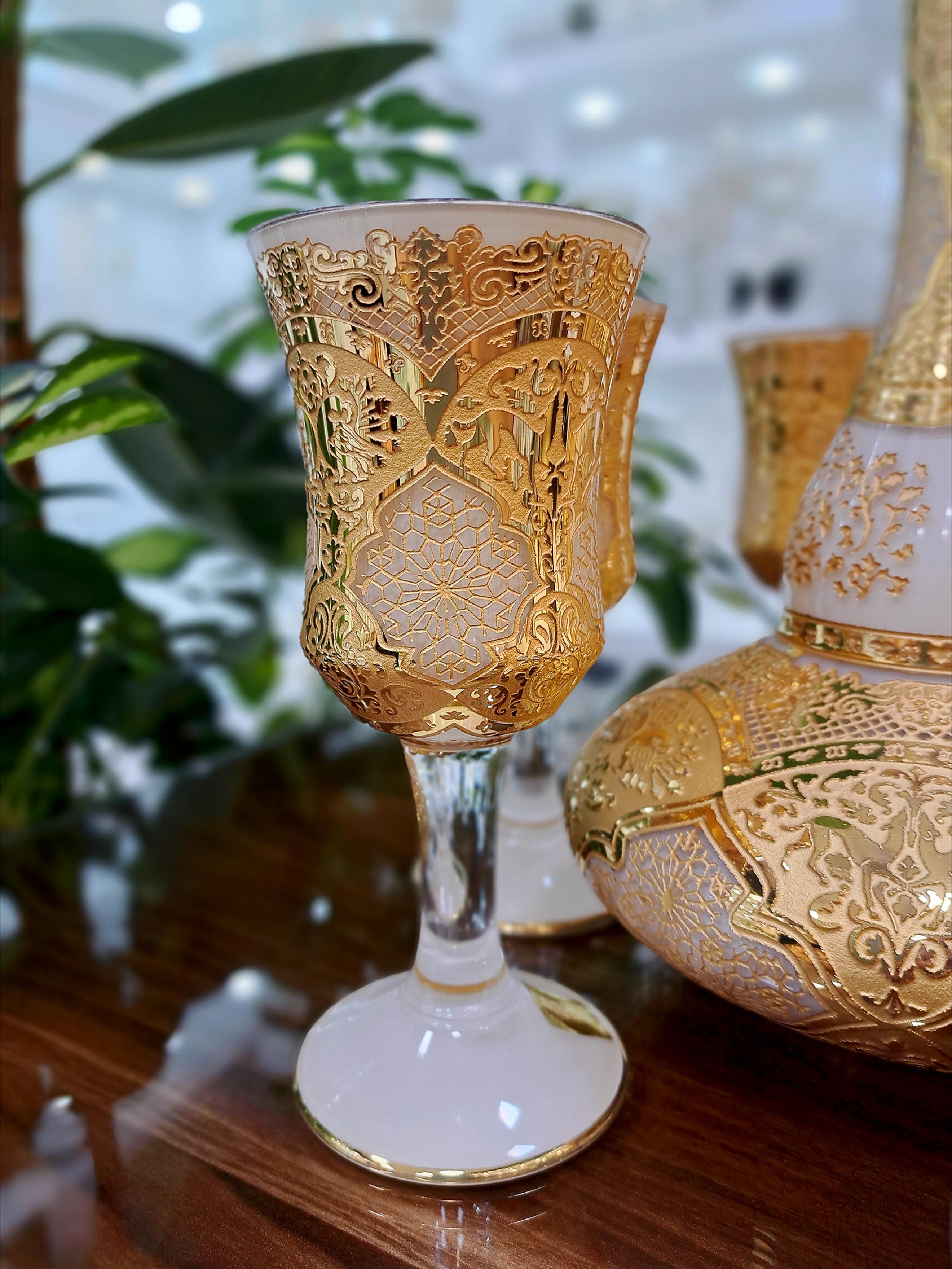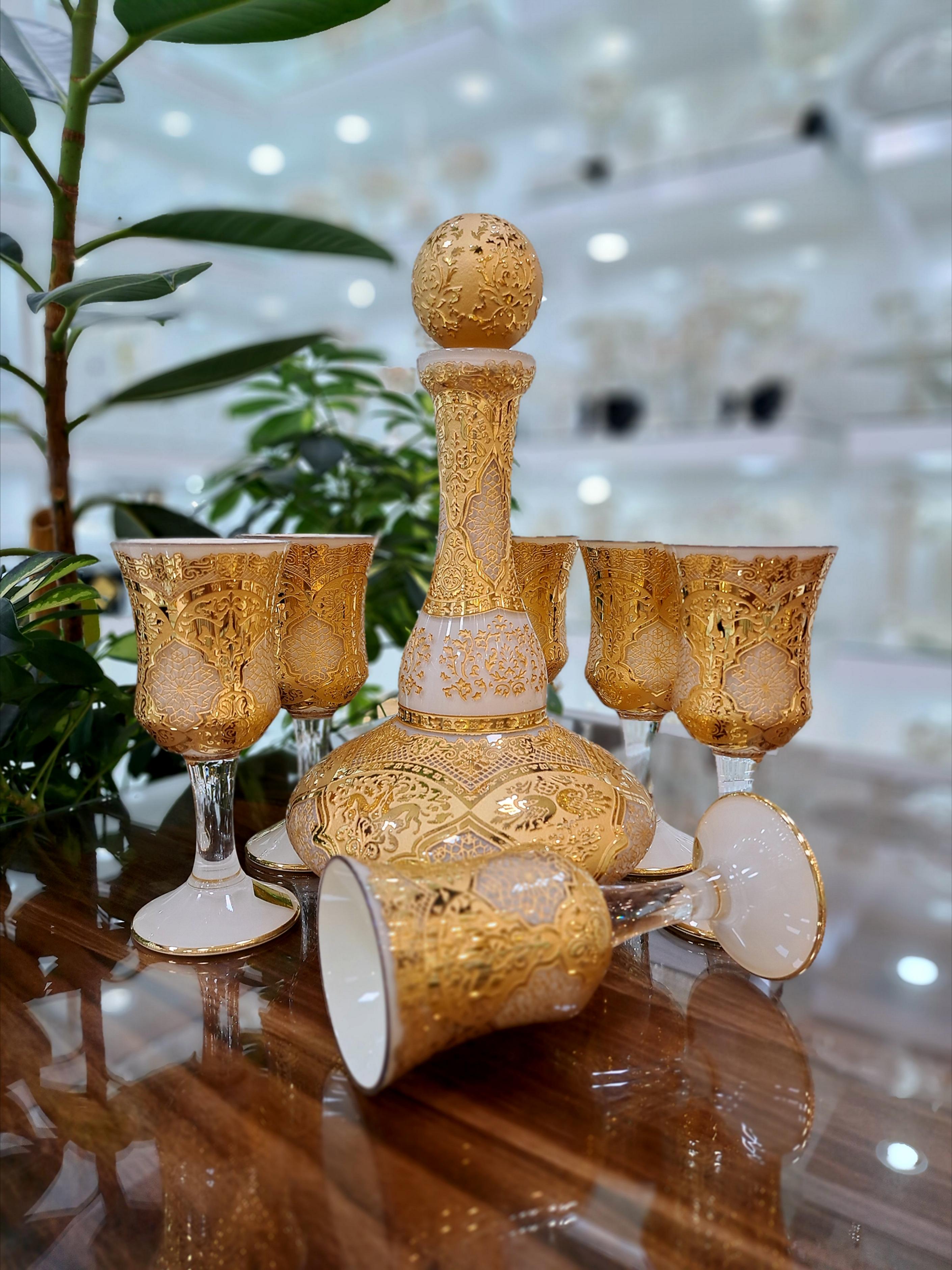ست تنگ و جام کریستال طلاکوب طرح ژاکلین رنگ کرم با طلاکاری 12 عیار اصل هلند مجموعه 8 پارچه