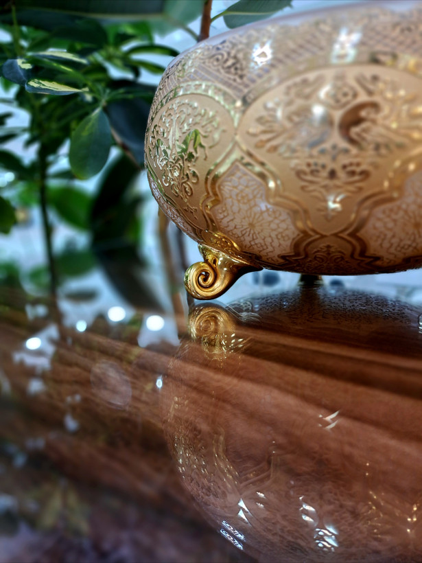 روی محصول از آب طلای 12 عیار اصل هلند استفاده شده است که طلاکاری زیبای روی محصول هنر دست میباشد.