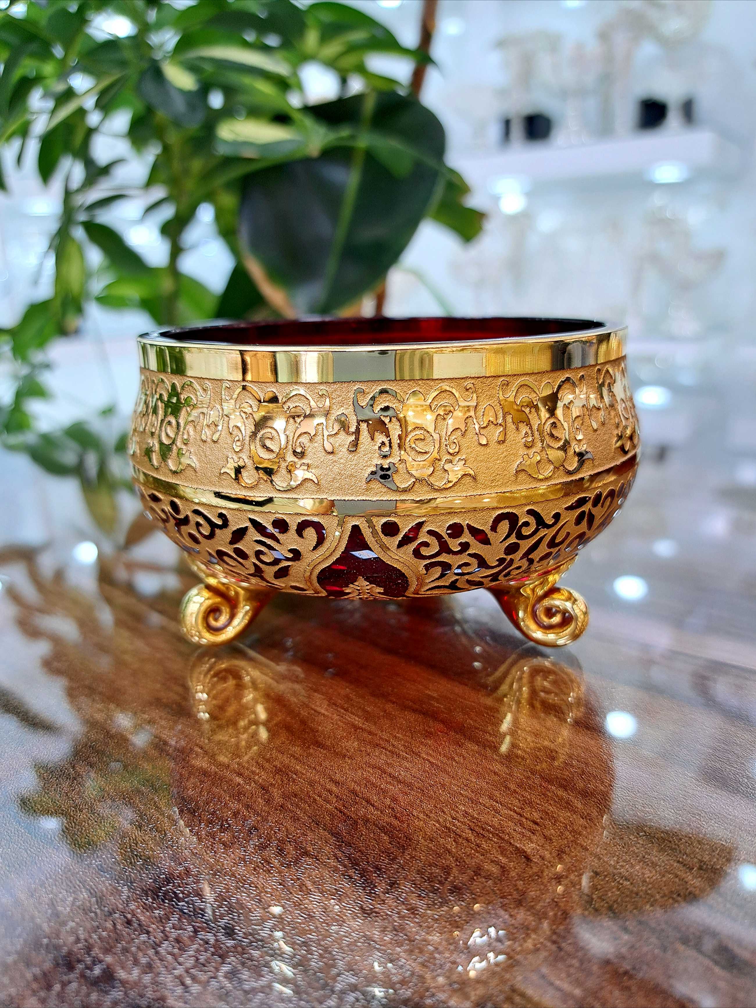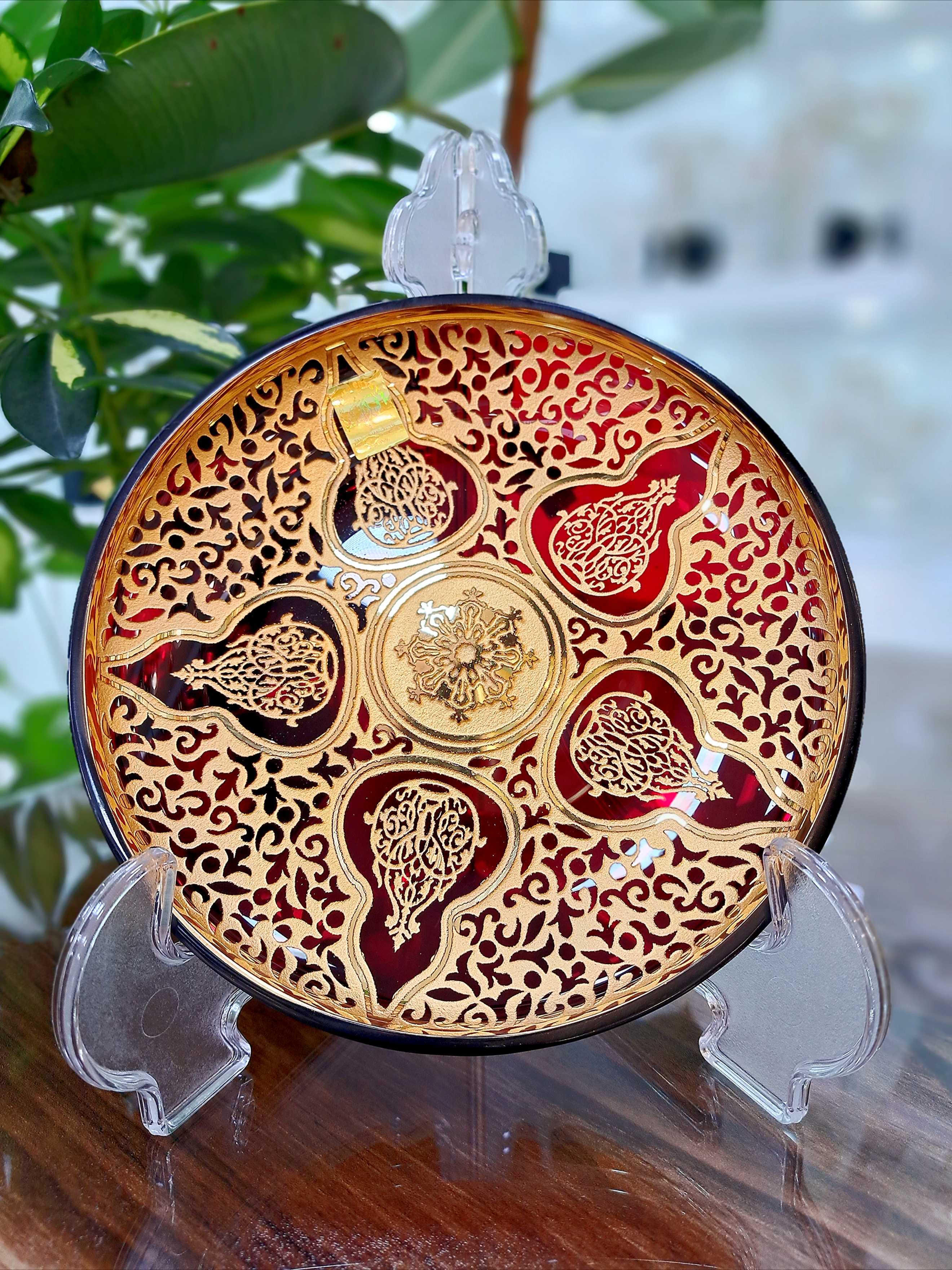 ست پیاله و پیش دستی کریستال طلاکوب طرح کاستل رنگ قرمز مجموعه 12 پارچه